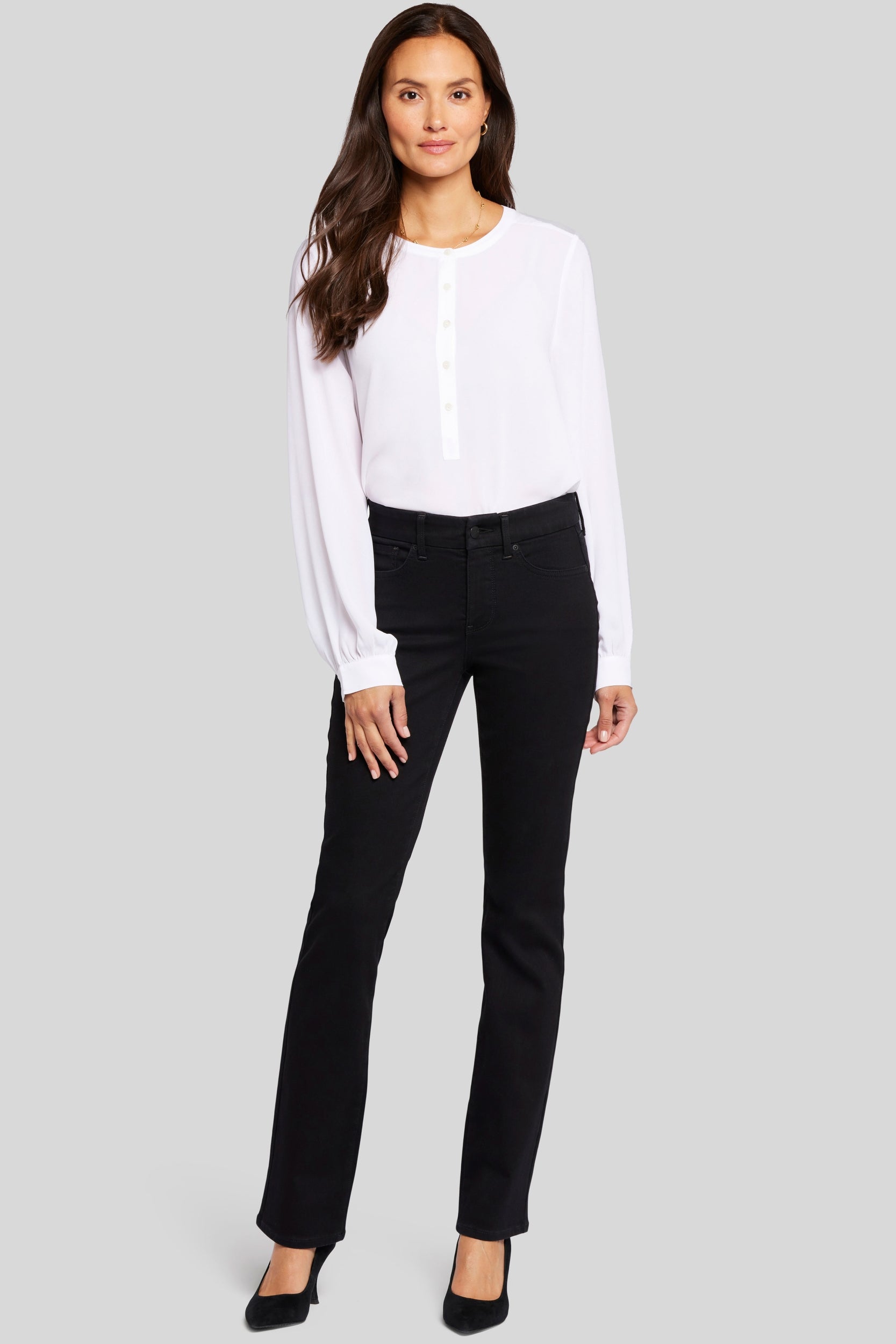 Ontworpen om zich naar jou te vormen, hebben de Waist-Match™ Marilyn Straight Jeans van NYDJ een magische satijnen elastiek die de binnenkant van de tailleband lijnt en zich vormt naar je taille voor een extra comfortabele pasvorm. De tijdloze, best verkochte silhouet valt recht van knie tot zoom en past goed bij alles. Het ontwerp bevat ook onze Lift Tuck® Technologie, die een gepatenteerd afslankend paneel gebruikt om aan de voorkant plat te maken en rondingen aan de achterkant te flatteren. Voelt aan als een aantrekjeans maar heeft de klassieke vijf-zakkenstijl met een ritssluiting en knoopsluiting. Deze jeans is gemaakt met milieuvriendelijke methoden die resulteren in een verminderd verbru