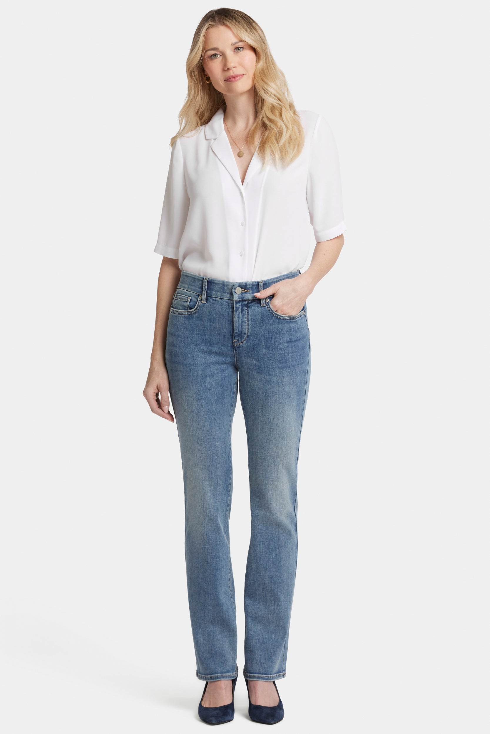 De Waist-Match™ Barbara Bootcut Jeans van NYDJ heeft een satijnen elastiek dat de binnenkant van de tailleband bekleedt en zich naar je taille vormt voor een extra comfortabele pasvorm. De traditionele bootcut-silhouet is flared aan de zoom, waardoor een tijdloze look ontstaat. Het ontwerp omvat ook onze Lift Tuck® Technologie, die gebruik maakt van een eigen slanker paneel om aan de voorkant vlak te maken en de rondingen aan de achterkant flatterend te maken. Voelt als een pull-on jean, maar heeft klassieke vijf-pocket styling met een rits en knoopsluiting. Deze jeans zijn gemaakt met milieuvriendelijke methoden die resulteren in verminderd water-, chemicaliën- en/of energieverbruik.