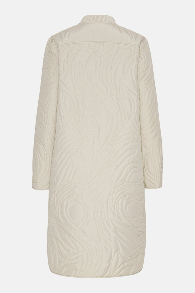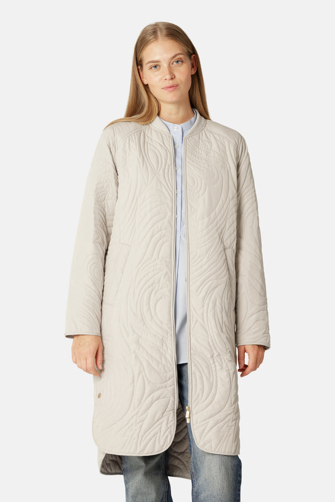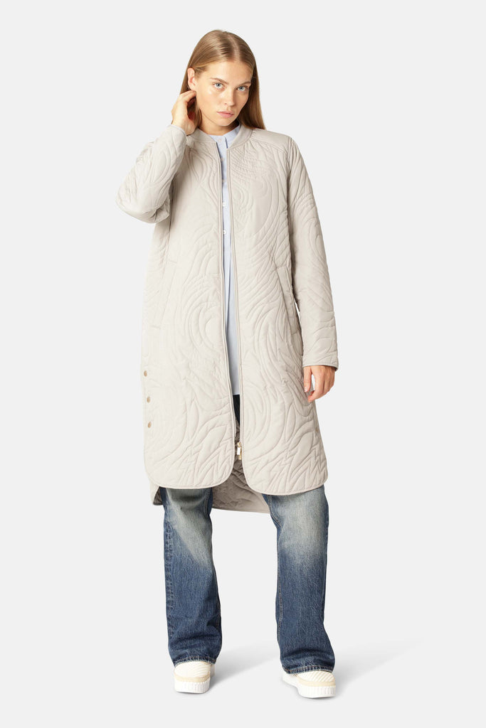 Lang gewatteerd A-lijn jack met zachte voering aan de binnenkant. Dit model is iets langer aan de achterkant. Details zijn onder andere zijsplitten met logodrukknoopsluiting, een tweewegrits aan de voorkant en een zachte ribkraag en manchetten. Een perfecte overgangsstijl, ideaal onder je regenjas voor extra warmte.