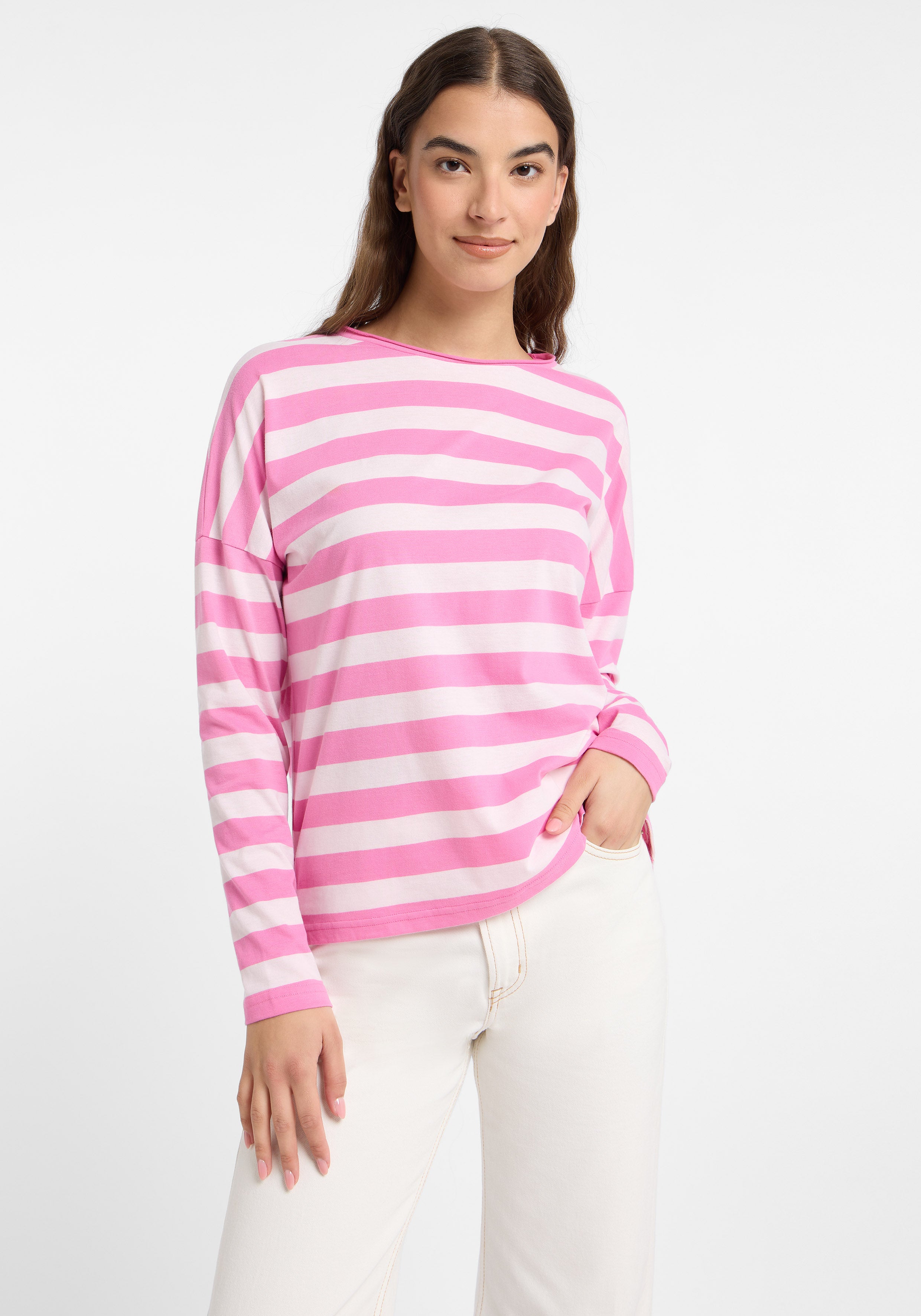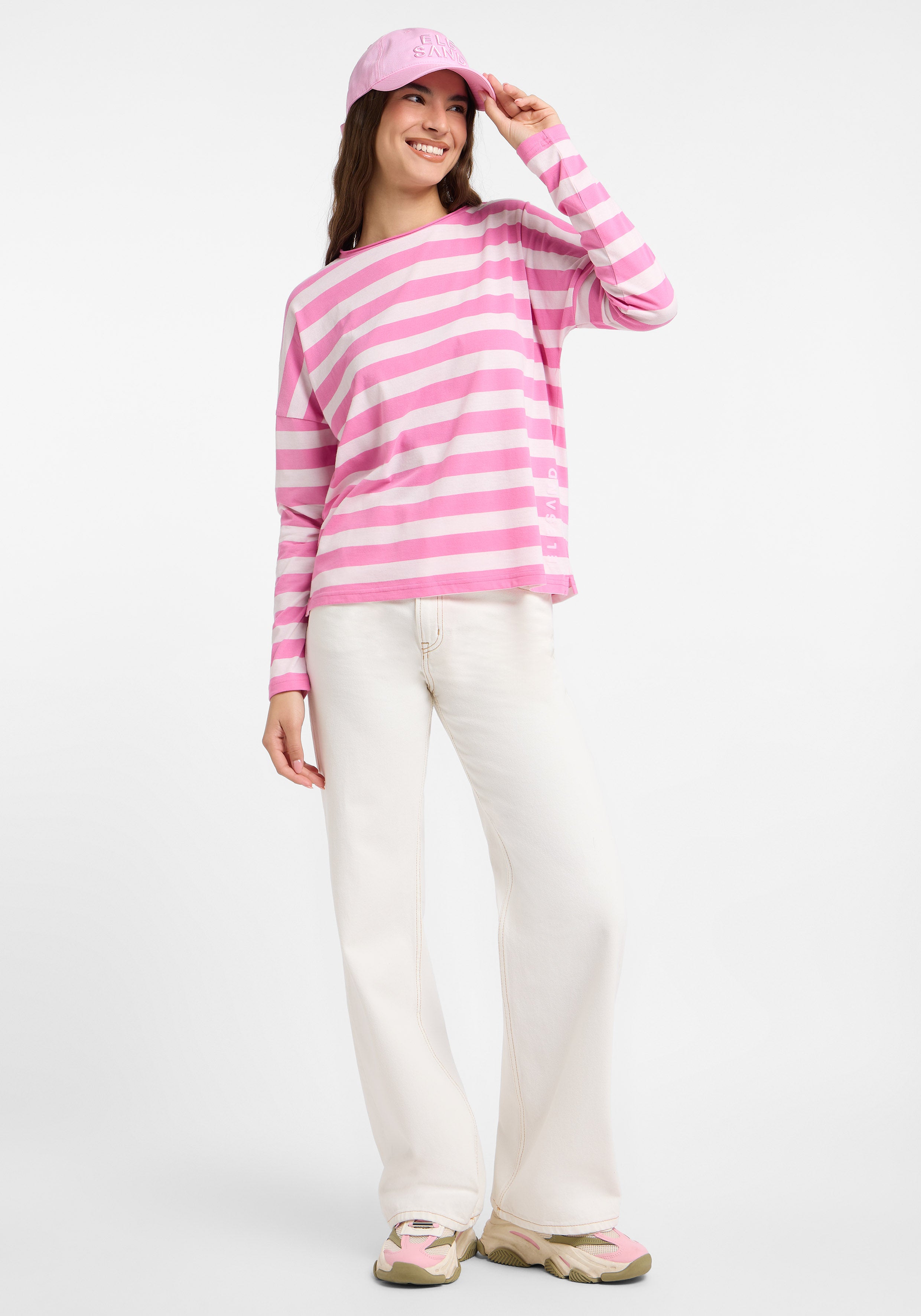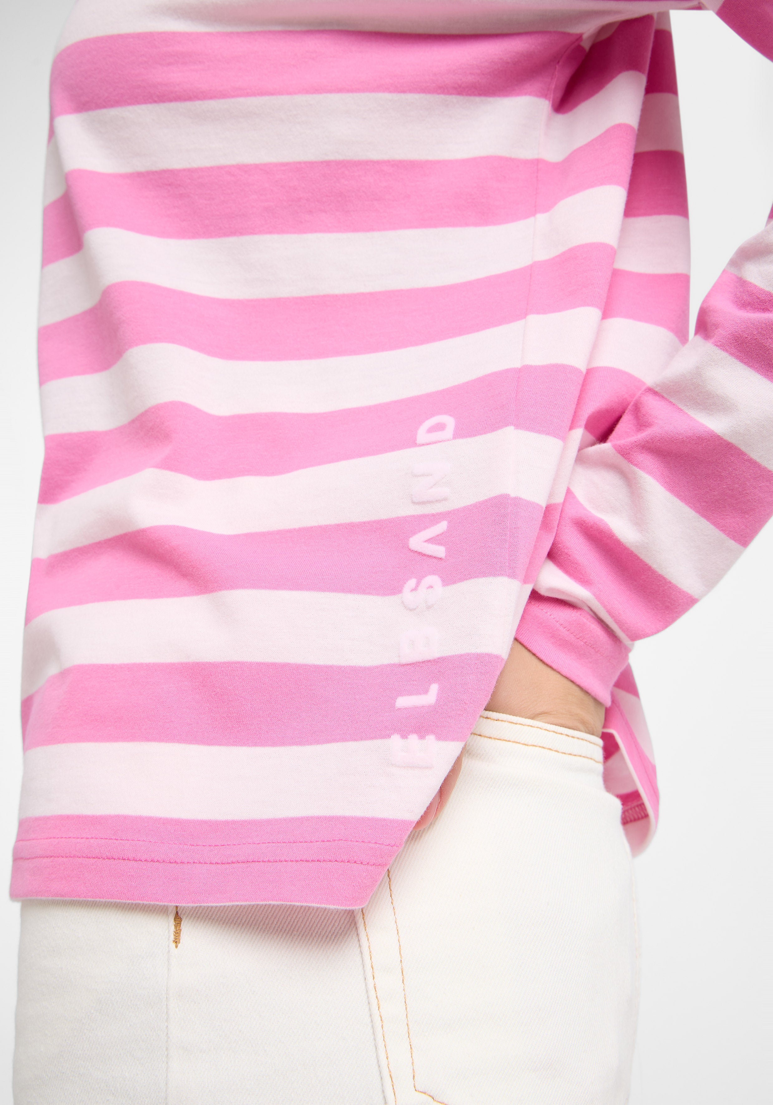 Het Elbsand Milia Lange Mouw T-shirt is een loszittend longsleeve van lichte single jersey kwaliteit met een modieuze streepjeslook en een zacht gevoel. Het heeft een boothals met een opengewerkte opgerolde zoom en een zachte logo-flockprint op de voorkant. Het modieuze streepjesshirt is verkrijgbaar in trendy kleurcombinaties en combineert comfort met stijl. Het is gemaakt van 50% katoen en 50% polyester, ontworpen voor vrouwen en perfect geschikt voor casual dagelijkse looks. Wasvoorschrift: machinewas op 30 graden fijnwas, niet geschikt voor de droger.