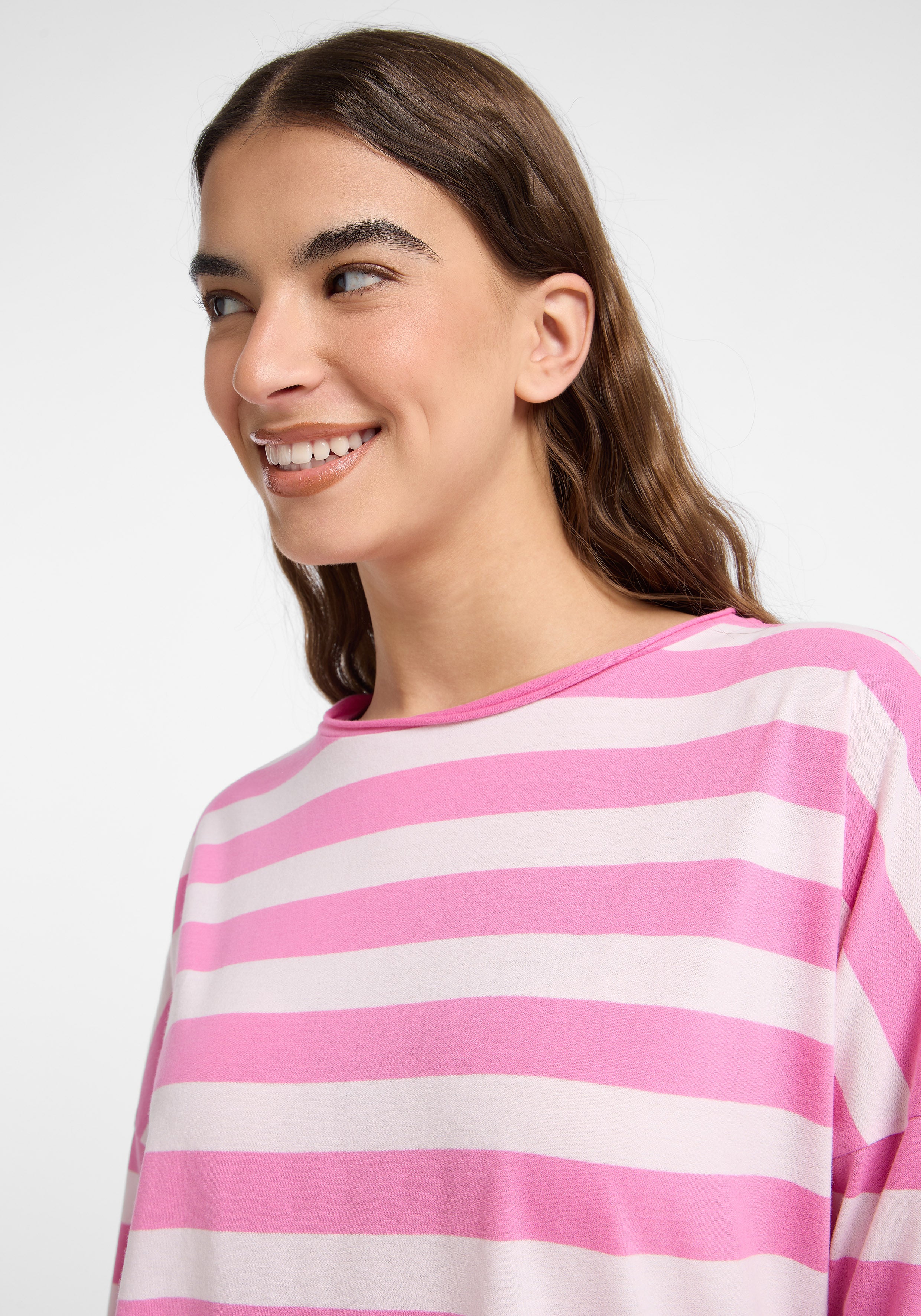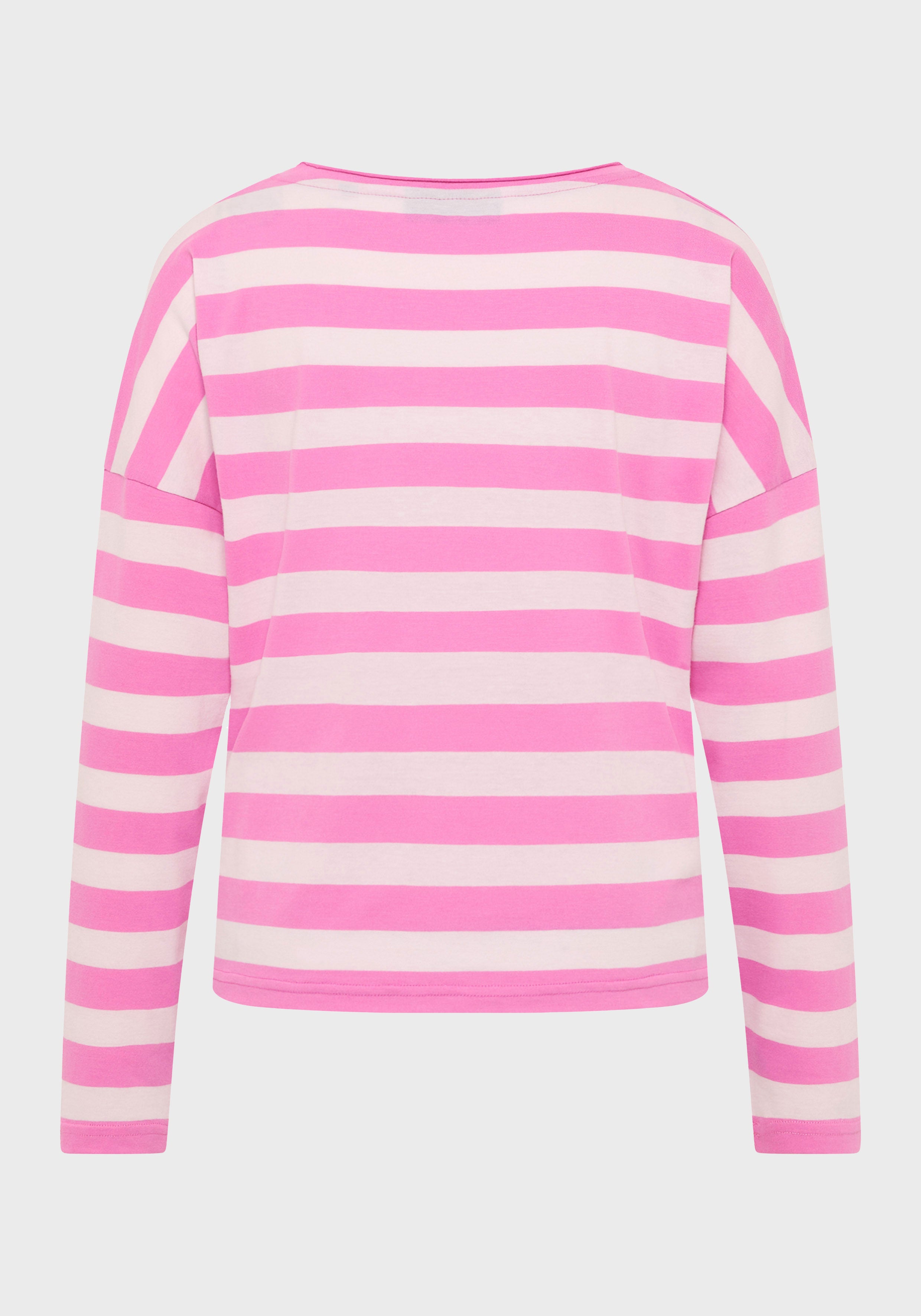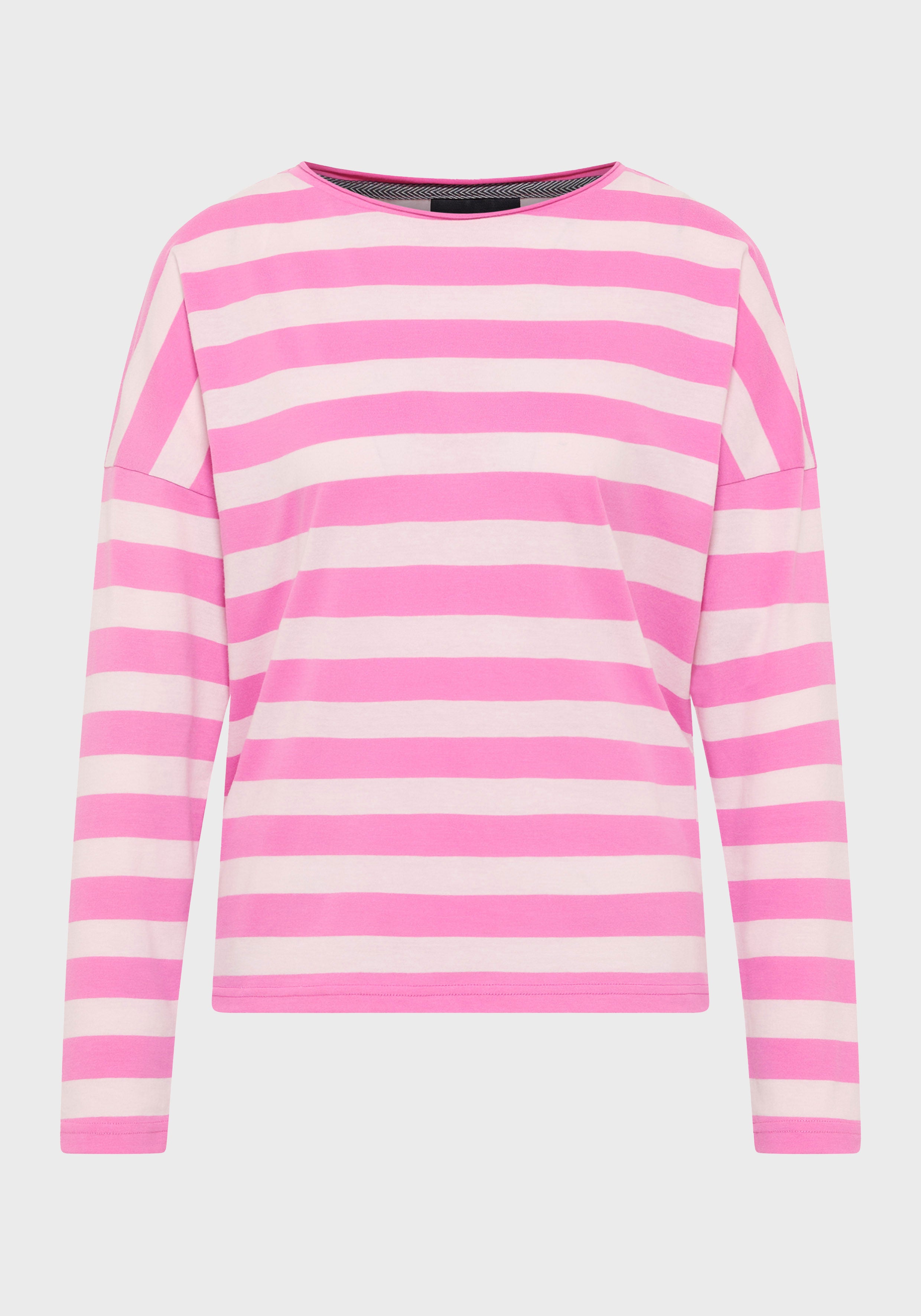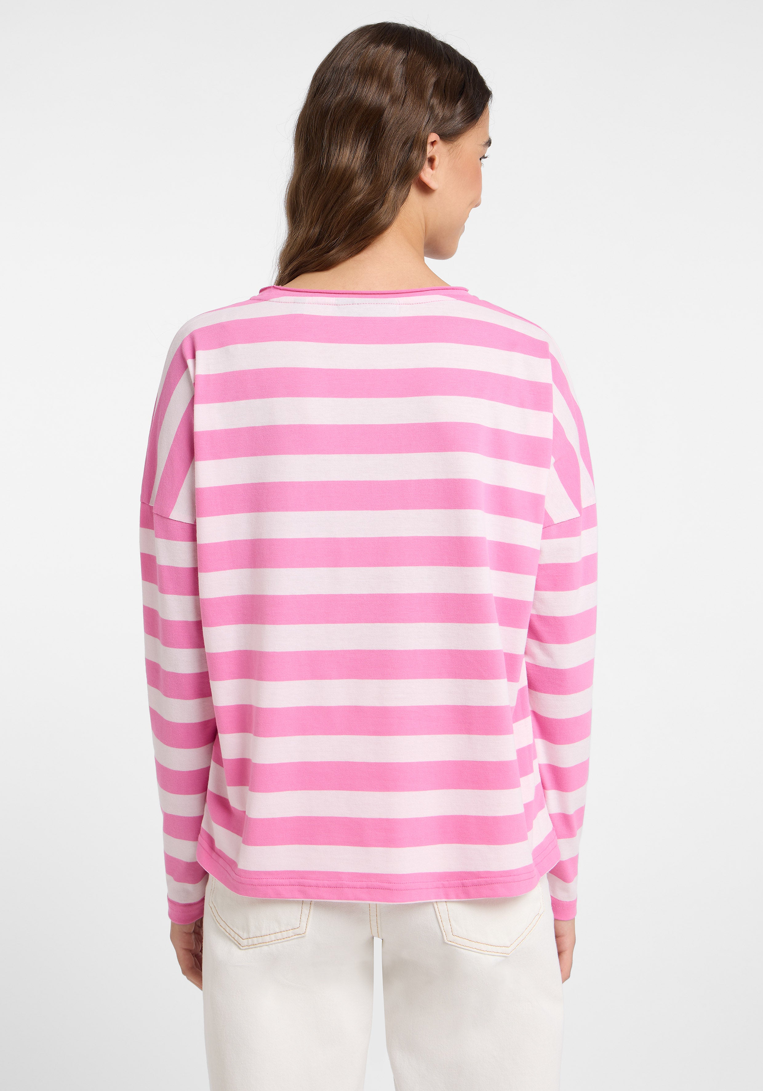 Het Elbsand Milia Lange Mouw T-shirt is een loszittend longsleeve van lichte single jersey kwaliteit met een modieuze streepjeslook en een zacht gevoel. Het heeft een boothals met een opengewerkte opgerolde zoom en een zachte logo-flockprint op de voorkant. Het modieuze streepjesshirt is verkrijgbaar in trendy kleurcombinaties en combineert comfort met stijl. Het is gemaakt van 50% katoen en 50% polyester, ontworpen voor vrouwen en perfect geschikt voor casual dagelijkse looks. Wasvoorschrift: machinewas op 30 graden fijnwas, niet geschikt voor de droger.