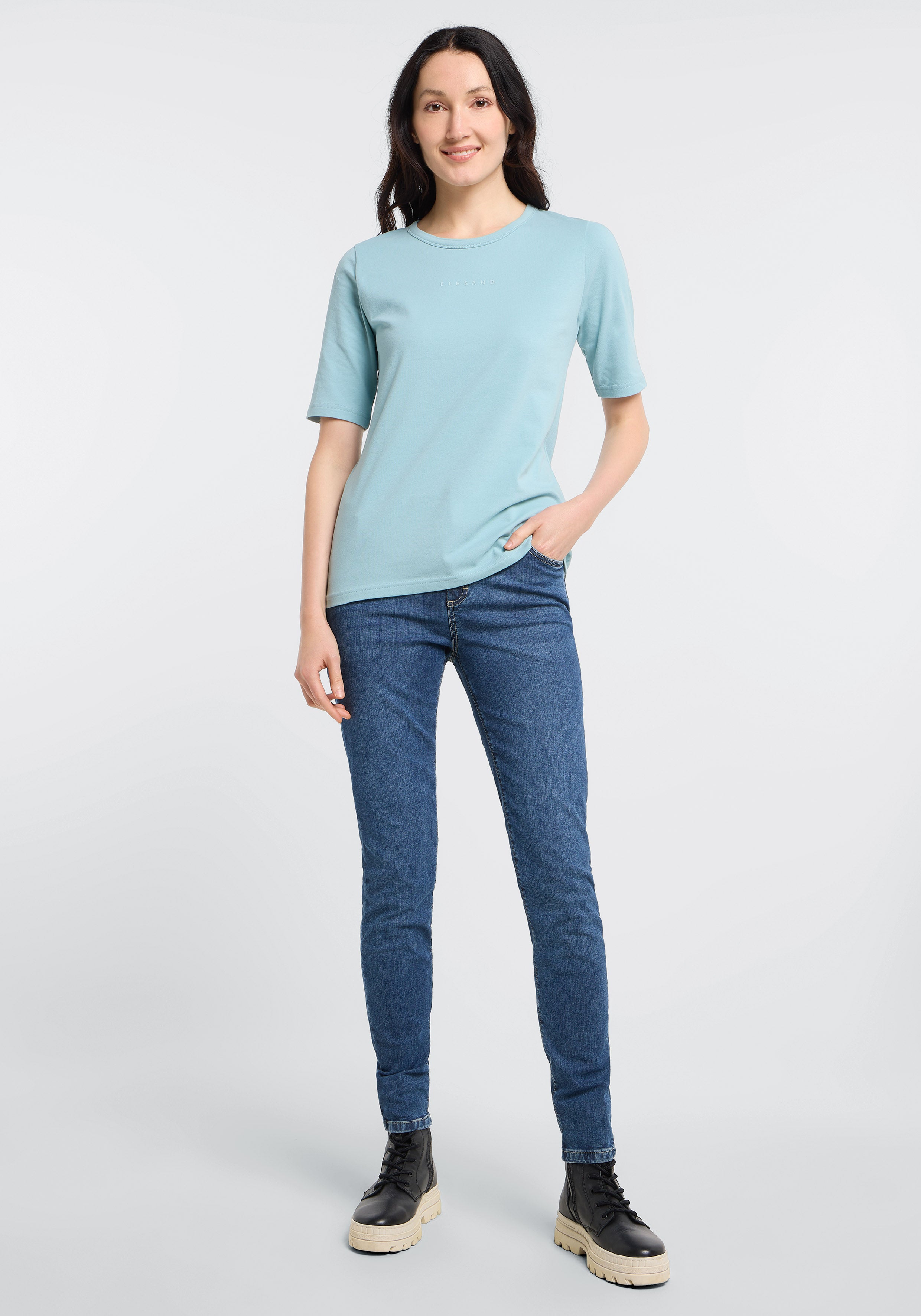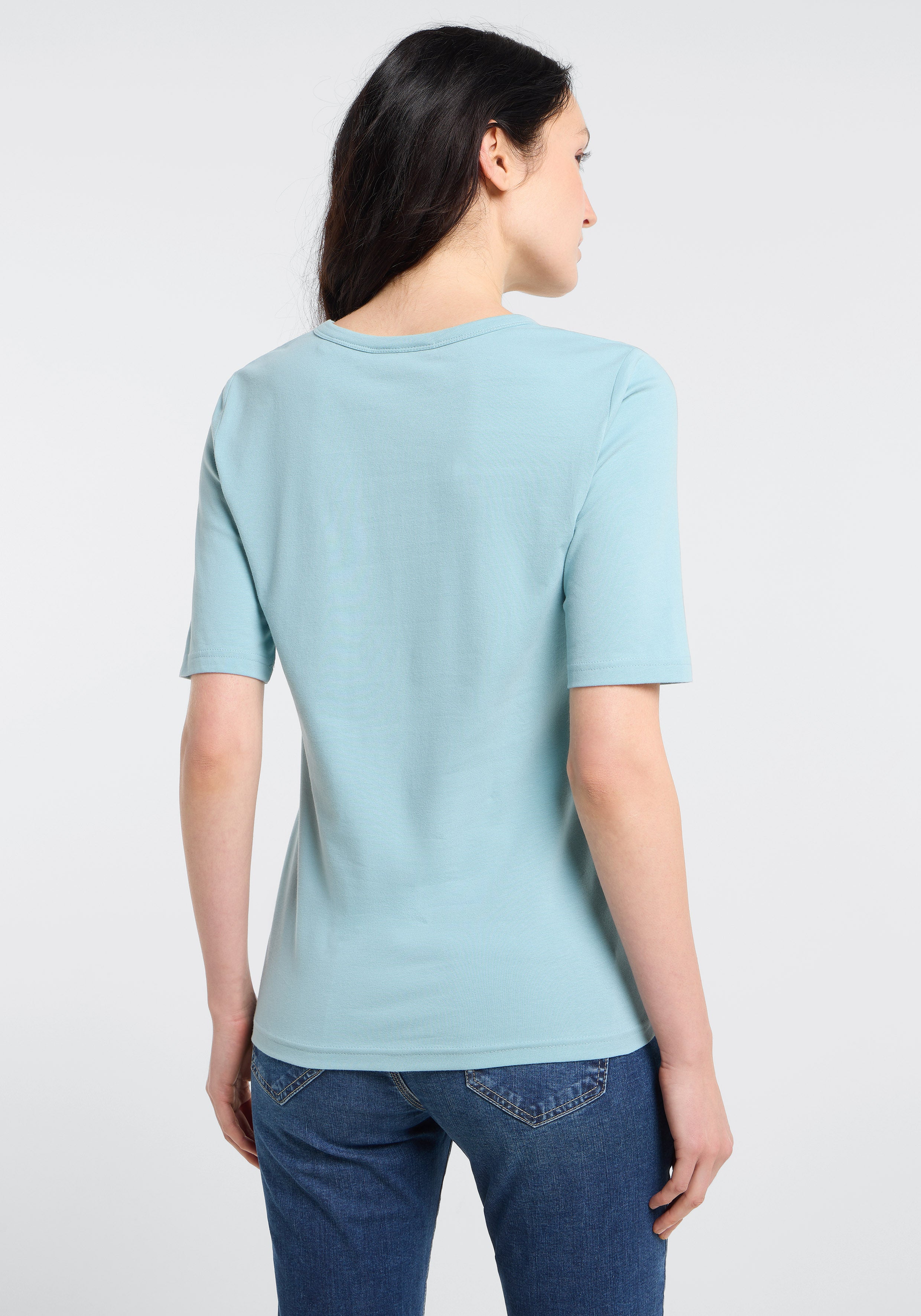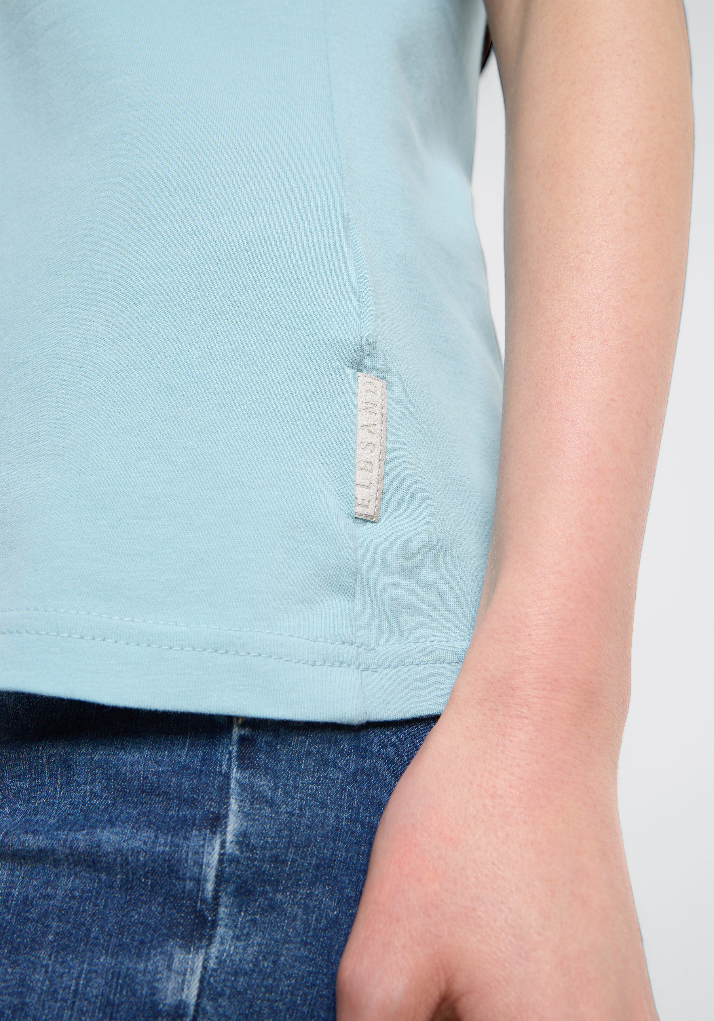 Het Elbsand Siva T-shirt is een nauwsluitend, stijlvol basic T-shirt voor dames. Het bestaat uit een zachte, elastische Single Jersey kwaliteit met 95% katoen en 5% elastaan, en biedt daardoor een prettig draagcomfort en een perfecte pasvorm. Het T-shirt heeft een klassieke ronde hals en halflange mouwen, waardoor het veelzijdig gedragen kan worden in elk seizoen. Een subtiele, zachte rubberprint op de borst zorgt voor een fijne, ingetogen accent. Het Siva T-shirt combineert minimalistische stijl met hoogwaardige afwerking en is ideaal voor dames die comfort en modieus design waarderen. Wasvoorschriften: machinewas op 30 graden, fijnwasprogramma, niet geschikt voor de droger.